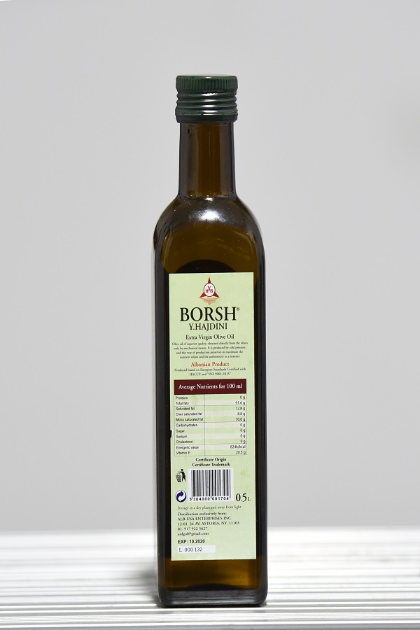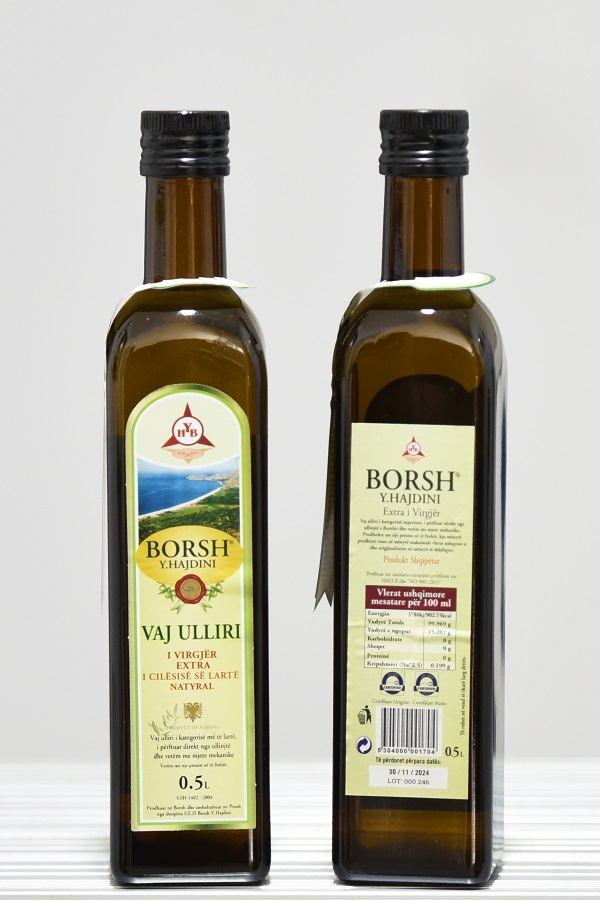 Maximal quality of the olive virgin oil. The production of the Ionian coast olives, olive of the Kalinjot variety. Olive oil is produced only with pressing in the cold. This way of production saves in a maximal way nutritional values and originality in an excellent way.